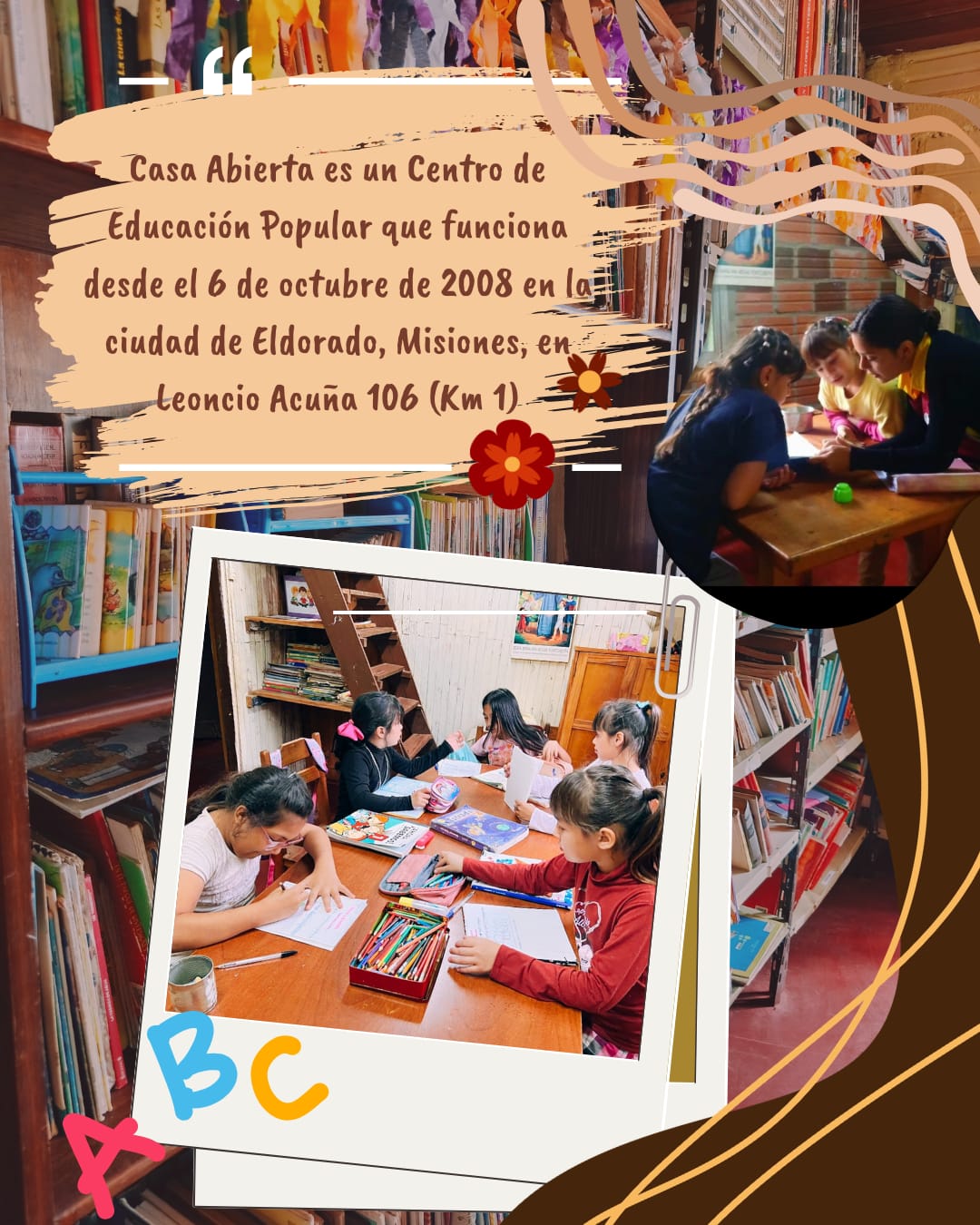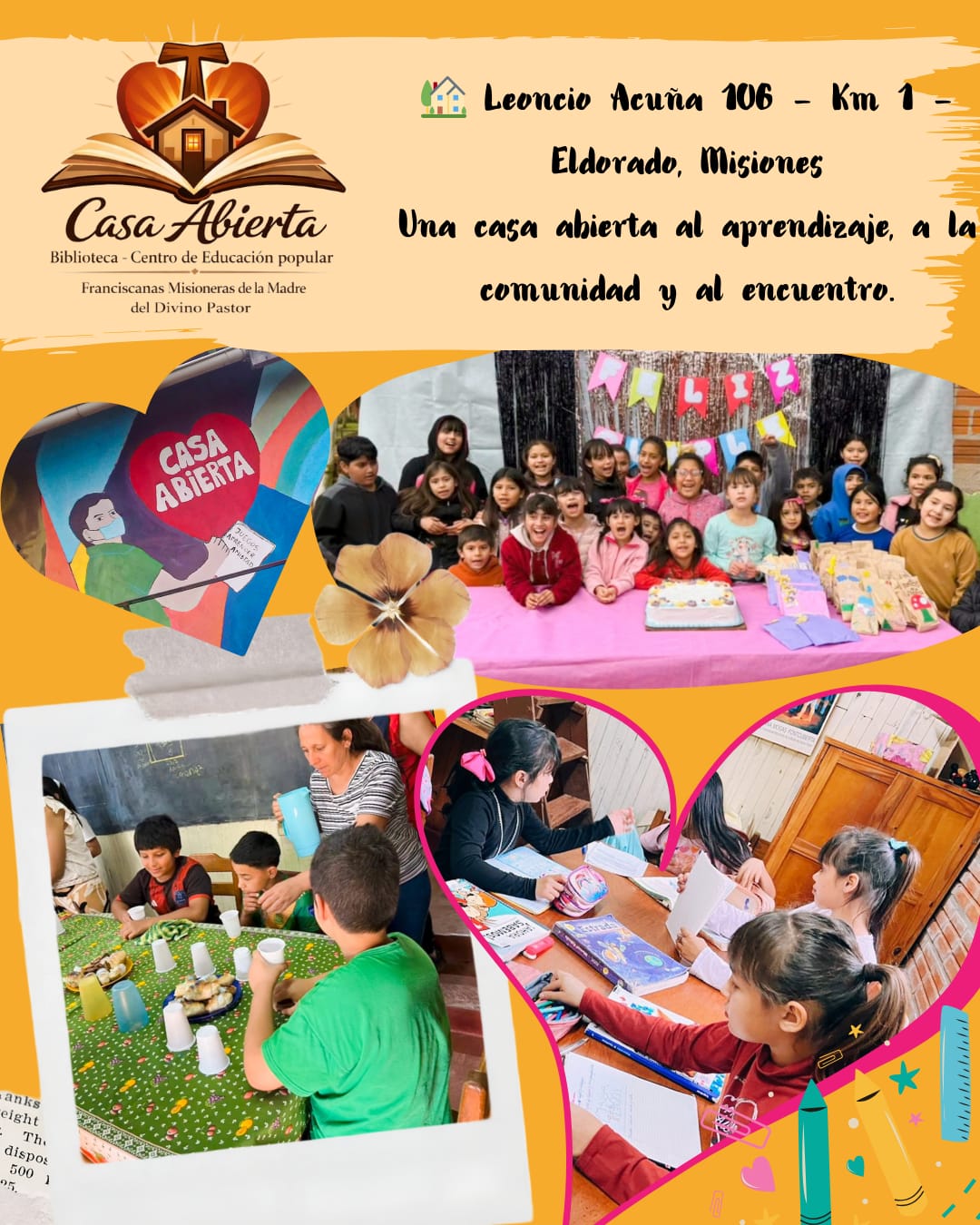 Casa Abierta es un Centro de Educación Popular que abrió sus puertas el 6 de octubre de 2008 en la ciudad de Eldorado, Misiones, ubicado en Leoncio Acuña 106 (Km 1). Nació por iniciativa de las Hermanas Franciscanas MM. de la Madre del Divino Pastor, con el propósito de brindar al barrio un lugar de encuentro, formación y acompañamiento.