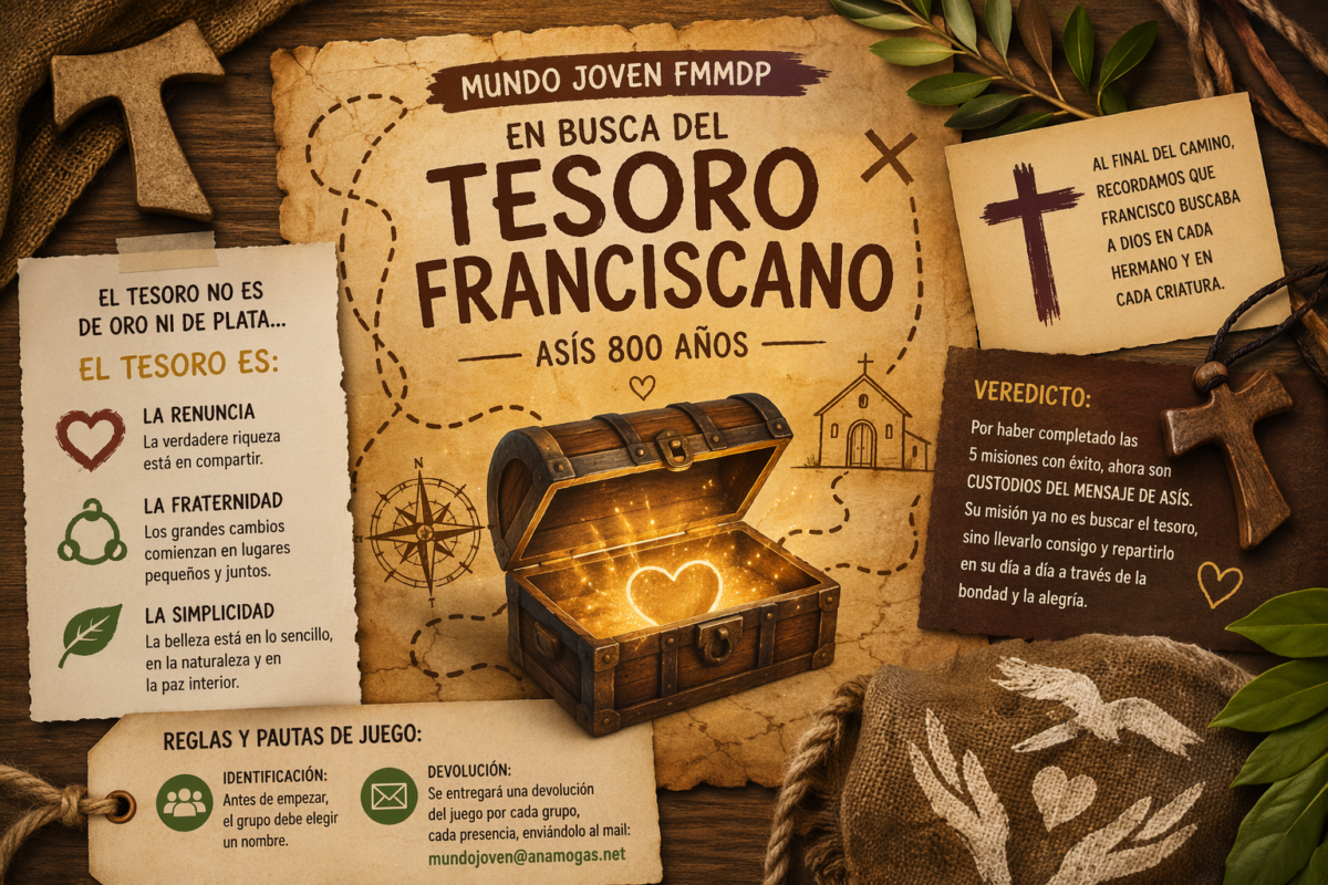 Desde el grupo Mundo Joven FMMDP nos llega una invitación especial para todos los jóvenes y la familia carismática de María Ana Mogas: participar en el juego-concurso “En busca del Tesoro Franciscano: Asís 800 años”. Una experiencia dinámica que invita a recorrer, de forma simbólica, los pasos de San Francisco y Santa Clara de Asís.