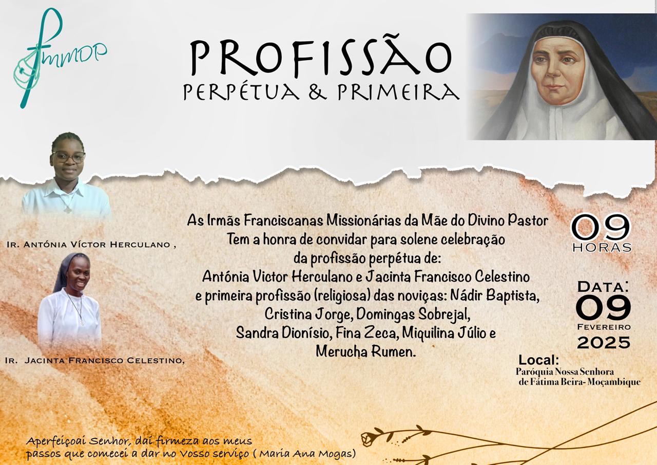 El próximo día 9 de febrero celebrarán su profesión perpetua las hermanas Jacinta Celestino y Antónia Víctor. En la misma ceremonia realizarán su primera profesión las novicias: Nadir Baptista, Cristina Jorge, Domingas Sobrejal, Sandra Donisio, Fina Zeca, Miquelina Júlio y Merecha Rumen.